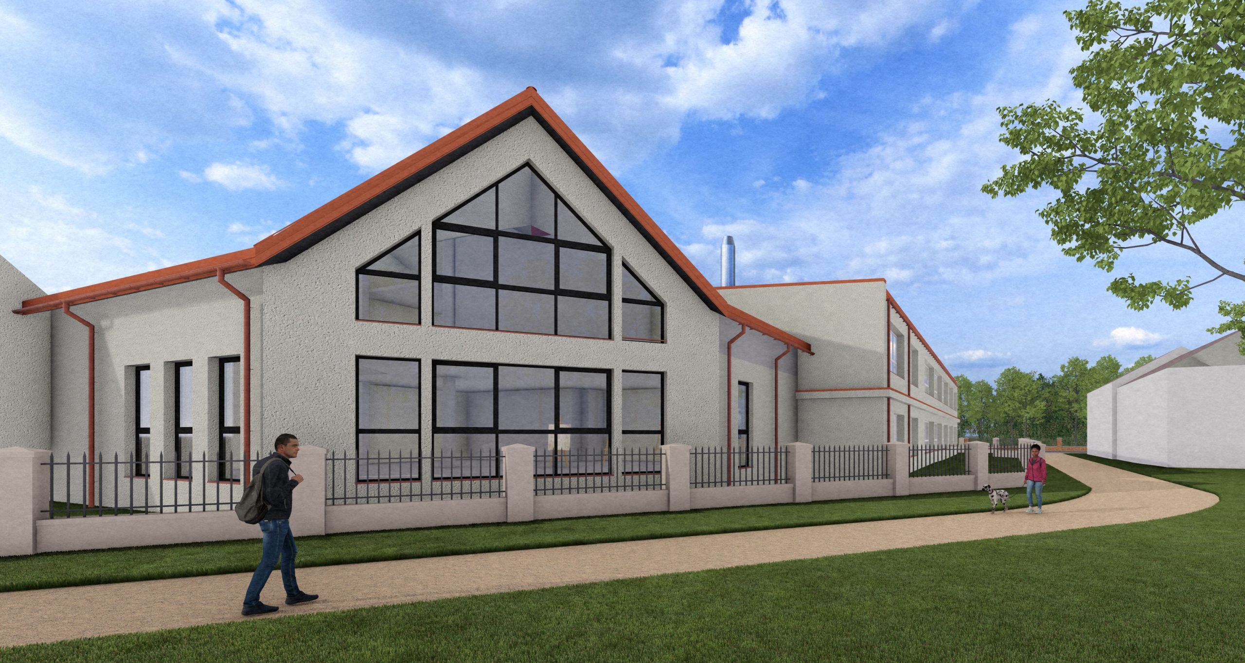 Jasna elewacja tworzy dla istniejącej i projektowanej roślinności tło. Przed wejściem głównym rośnie jarzębina, pod którą będzie można spocząć. Z tyłu budynku zachowano piękne duże drzewa oraz zaprojektowano zieleń towarzyszącą, wśród której będzie można posiedzieć na ławeczce.