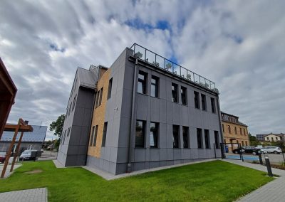 Zlokalizowany w przemysłowym kwartale miasta dwukondygnacyjny budynek łączy funkcje usługowe – gabinety lekarskie i handlowe . Bryła operująca wklęsłymi elementami nadwieszenia od głównego wejścia przyciąga zainteresowanie klientów.