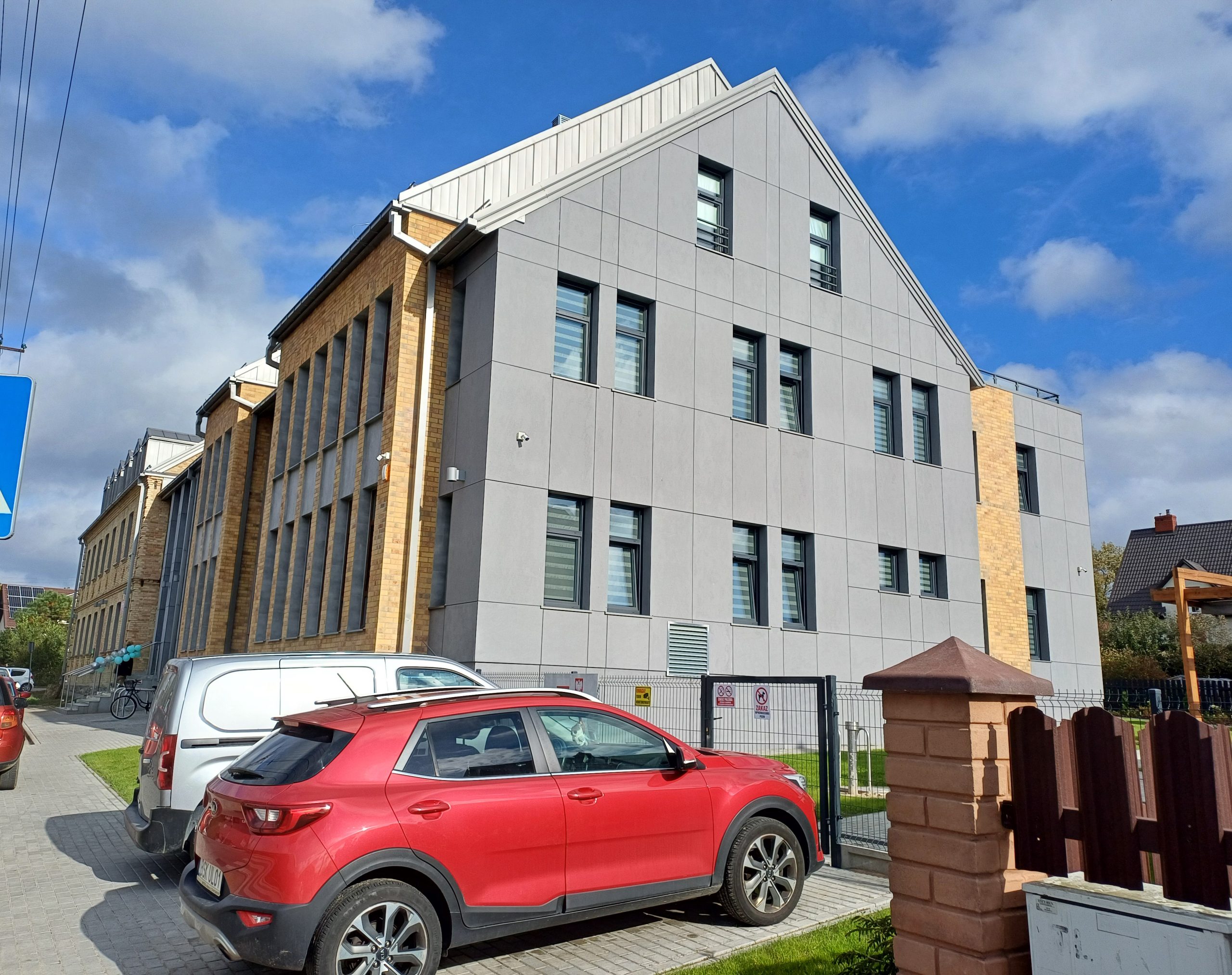 Jednolitość stylistyczną uzyskano stosując w nowej części okładzinę z cegły ceramicznej w kolorze zbliżonym do cegły kamienicy.