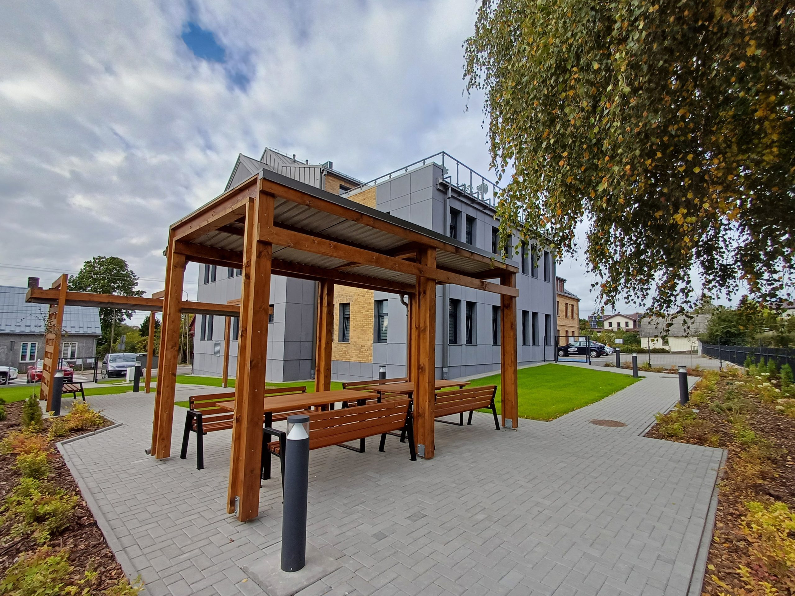 Jasna elewacja tworzy dla istniejącej i projektowanej roślinności tło. Przed wejściem głównym rośnie jarzębina, pod którą będzie można spocząć. Z tyłu budynku zachowano piękne duże drzewa oraz zaprojektowano zieleń towarzyszącą, wśród której będzie można posiedzieć na ławeczce.