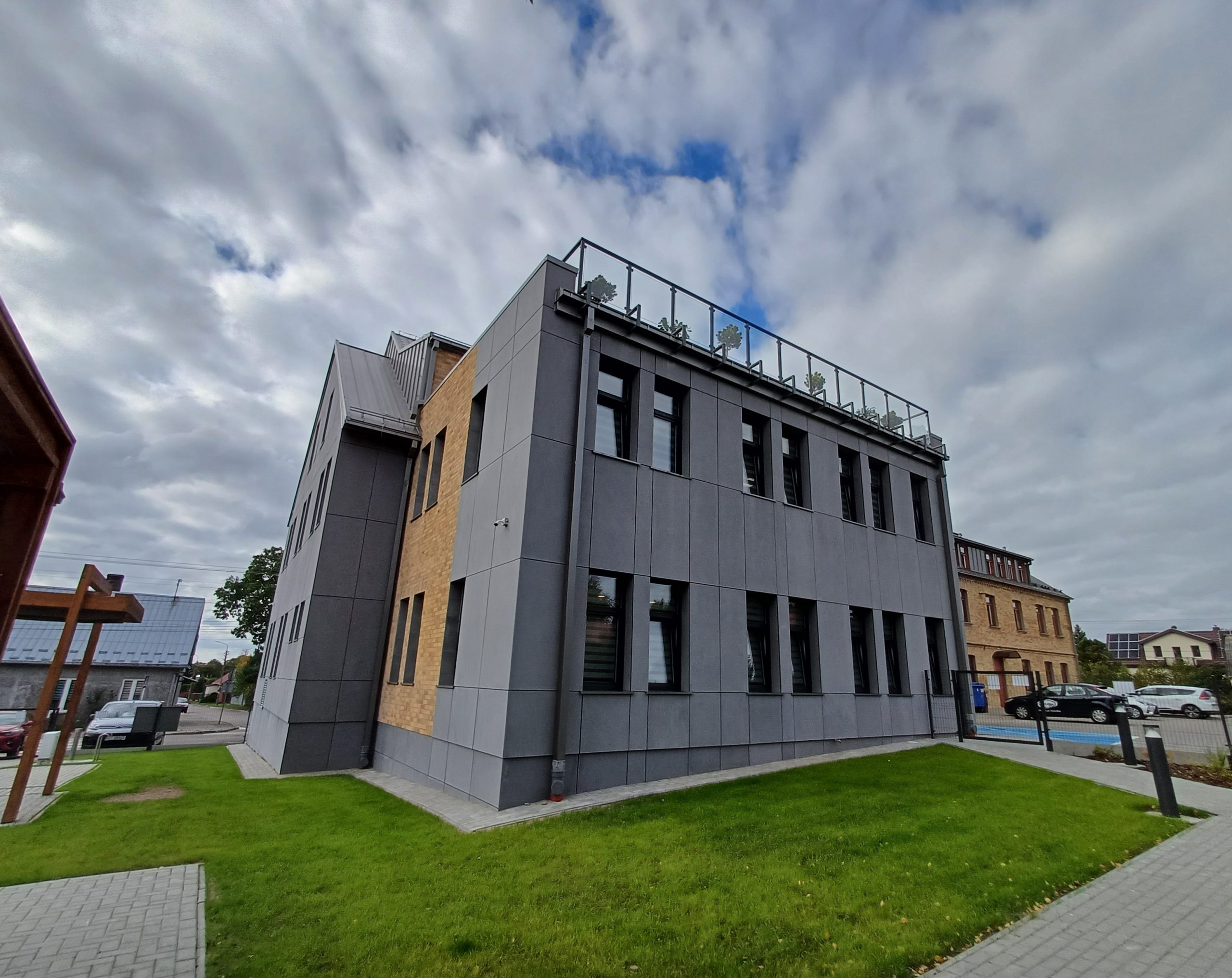 Zlokalizowany w przemysłowym kwartale miasta dwukondygnacyjny budynek łączy funkcje usługowe – gabinety lekarskie i handlowe . Bryła operująca wklęsłymi elementami nadwieszenia od głównego wejścia przyciąga zainteresowanie klientów.